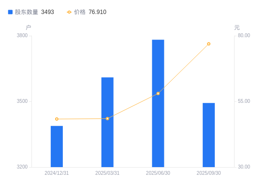 近一年(2024年9月30日至2025年9月30日),毕得医药A股股东户数从4111户,减低至3493户,降幅15.03%,区间股价上涨142.54%。
