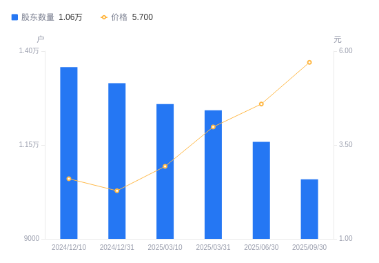 近一年(2024年9月30日至2025年9月30日),ST迪威迅A股股东户数从1.36万户,减低至1.06万户,降幅21.88%,区间股价上涨235.29%。