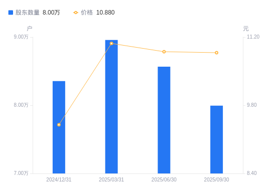 近一年(2024年9月30日至2025年9月30日),东方国信A股股东户数从8.52万户,减低至8万户,降幅6.16%,区间股价上涨48.23%。