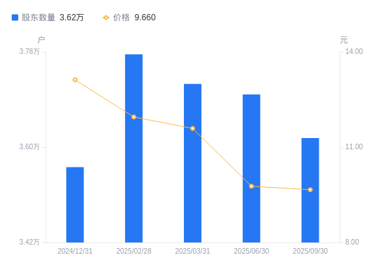 近一年(2024年9月30日至2025年9月30日),TCL智家A股股东户数从4.26万户,减低至3.62万户,降幅15.09%,区间股价下跌11.29%。