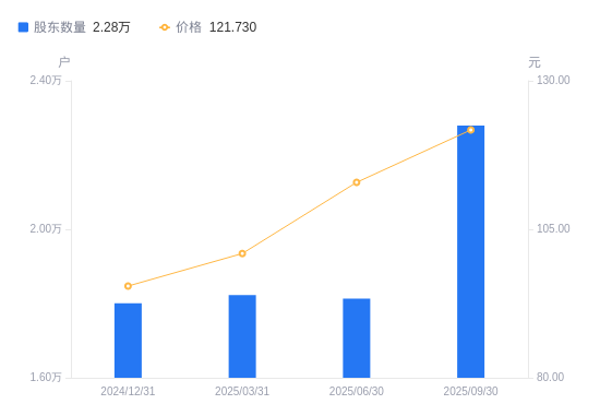 10月29日消息,数据显示,截至2025年9月30日,安克创新A股股东总户数为2.28万户,较上期(2025年6月30日)增加4662户,增幅25.71%。公司最新A股总股本为5.36亿股,其中流通A股3.02亿股,户均持有流通A股数量为1.32万股,较上期减少3202.43股,降幅19.47%;户均持流通A股市值161.25万元,较上期减少24.46万元,降幅13.17%。