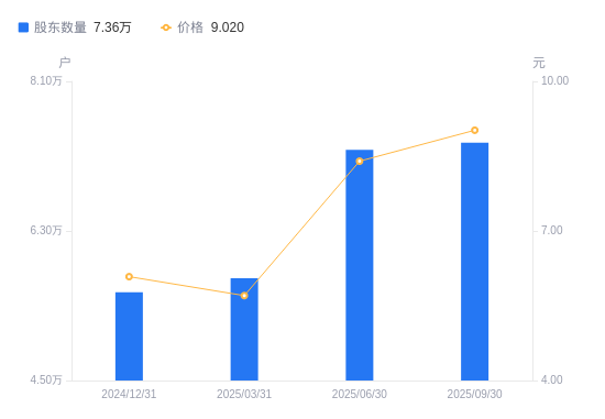 近一年(2024年9月30日至2025年9月30日),千红制药A股股东户数从6.01万户,增加至7.36万户,增幅22.41%,区间股价上涨66.94%。