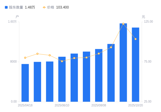 近一年(2024年11月8日至2025年10月20日),中熔电气A股股东户数从6249户,增加至1.48万户,增幅137.54%,区间股价上涨36.78%。
