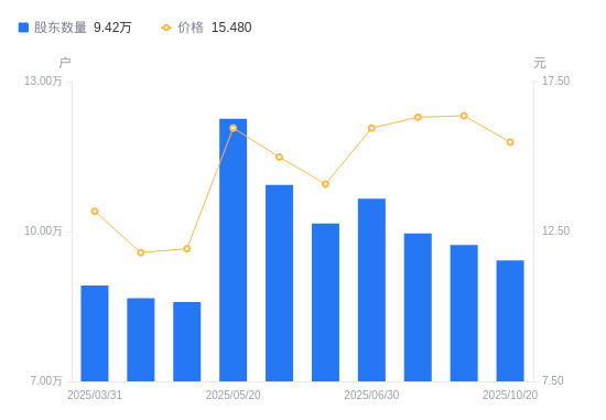 近一年(2024年11月29日至2025年10月20日),天源迪科A股股东户数从9.54万户,减低至9.42万户,降幅1.25%,区间股价上涨15.82%。