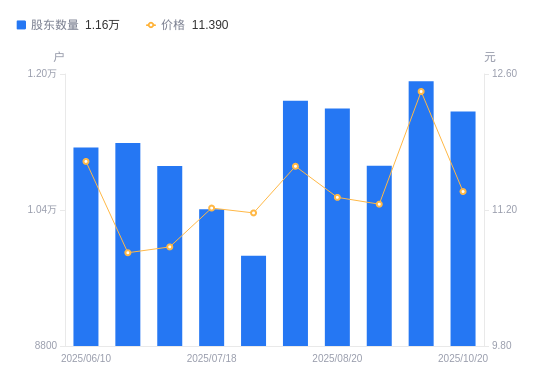 近一年(2024年12月31日至2025年10月20日),镇海股份A股股东户数从1.17万户,减低至1.16万户,降幅0.99%,区间股价上涨34.47%。