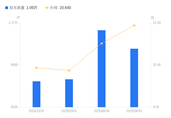 近一年(2024年9月30日至2025年9月30日),海象新材A股股东户数从1.14万户,减低至1.06万户,降幅6.89%,区间股价上涨62.06%。