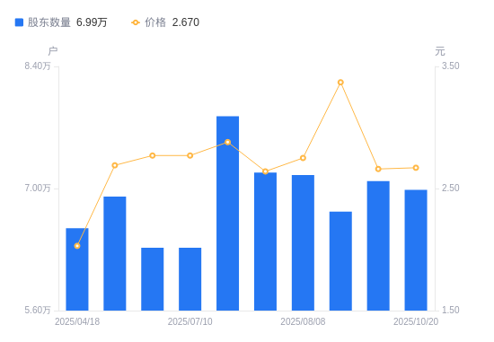 近一年(2024年11月20日至2025年10月20日),金浦钛业A股股东户数从6.85万户,增加至6.99万户,增幅1.98%,区间股价上涨5.95%。