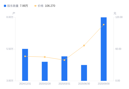 近一年(2024年9月30日至2025年9月30日),长芯博创A股股东户数从3.94万户,增加至7.99万户,增幅102.87%,区间股价上涨446.94%。