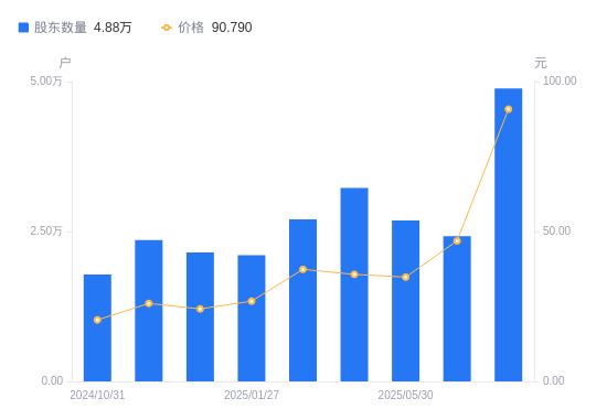 10月29日消息,数据显示,截至2025年9月30日,上海洗霸A股股东总户数为4.88万户,较上期(2025年6月30日)增加2.46万户,增幅101.84%。公司最新A股总股本为1.75亿股,其中流通A股1.75亿股,户均持有流通A股数量为3592.52股,较上期减少3658.73股,降幅50.46%;户均持流通A股市值32.62万元,较上期减少1.37万元,降幅4.03%。