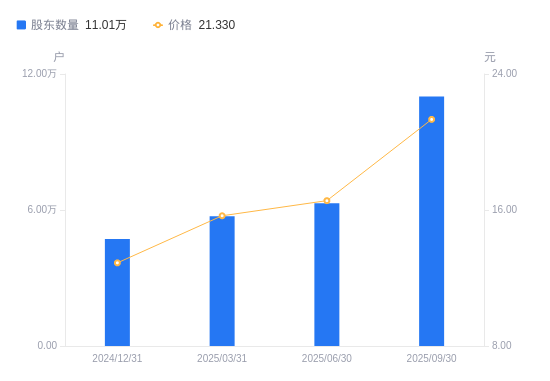 10月29日消息,数据显示,截至2025年9月30日,翰宇药业A股股东总户数为11.01万户,较上期(2025年6月30日)增加4.71万户,增幅74.86%。公司最新A股总股本为8.83亿股,其中流通A股7.46亿股,户均持有流通A股数量为6771.81股,较上期减少5069.55股,降幅42.81%;户均持流通A股市值14.44万元,较上期减少5.15万元,降幅26.30%。
