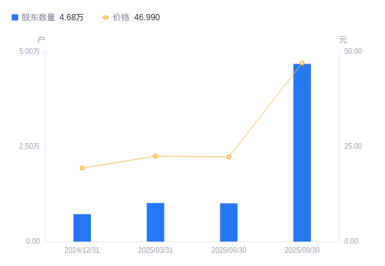 近一年(2024年9月30日至2025年9月30日),大元泵业A股股东户数从7855户,增加至4.68万户,增幅495.70%,区间股价上涨146.98%。