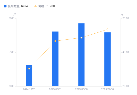 近一年(2024年9月30日至2025年9月30日),迈信林A股股东户数从4284户,增加至6974户,增幅62.79%,区间股价上涨81.30%。