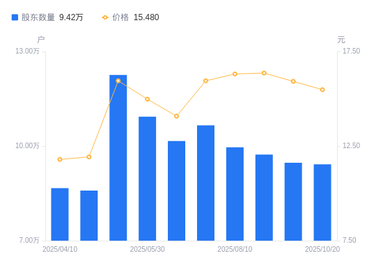 近一年(2024年10月10日至2025年10月10日),天源迪科A股股东户数从9.48万户,减低至9.47万户,降幅0.06%,区间股价上涨8.78%。
