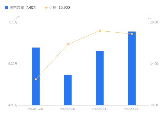 10月30日消息,数据显示,截至2025年9月30日,信雅达A股股东总户数为7.4万户,较上期(2025年6月30日)增加6619户,增幅9.83%。公司最新A股总股本为4.66亿股,其中流通A股4.58亿股,户均持有流通A股数量为6189.43股,较上期减少608.39股,降幅8.95%;户均持流通A股市值10.46万元,较上期减少1.24万元,降幅10.61%。