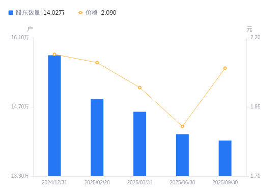 近一年(2024年9月30日至2025年9月30日),申华控股A股股东户数从13.98万户,增加至14.02万户,增幅0.31%,区间股价上涨43.15%。