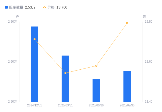 近一年(2024年9月30日至2025年9月30日),第一医药A股股东户数从2.09万户,增加至2.53万户,增幅20.93%,区间股价上涨21.88%。