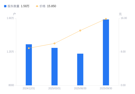 近一年(2024年9月30日至2025年9月30日),正裕工业A股股东户数从1.31万户,增加至1.59万户,增幅20.94%,区间股价上涨103.21%。
