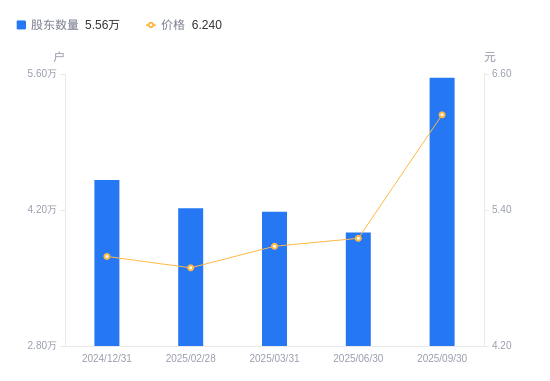 近一年(2024年9月30日至2025年9月30日),旷达科技A股股东户数从4.05万户,增加至5.56万户,增幅37.30%,区间股价上涨53.32%。