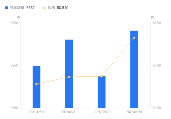 近一年(2024年9月30日至2025年9月30日),有研粉材A股股东户数从5570户,增加至5662户,增幅1.65%,区间股价上涨64.74%。