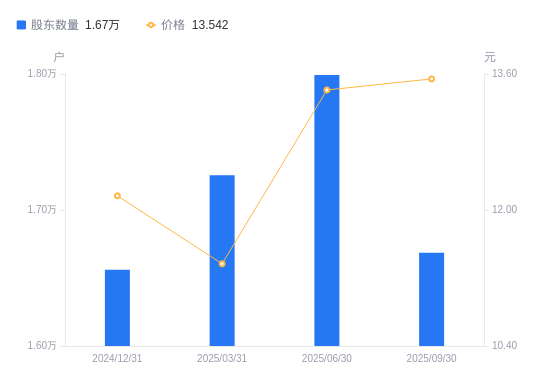 10月30日消息,数据显示,截至2025年9月30日,普莱柯A股股东总户数为1.67万户,较上期(2025年6月30日)减少1306户,降幅7.26%。公司最新A股总股本为3.46亿股,其中流通A股3.46亿股,户均持有流通A股数量为2.07万股,较上期增加1505.45股,增幅7.83%;户均持流通A股市值28.09万元,较上期增加2.29万元,增幅8.87%。