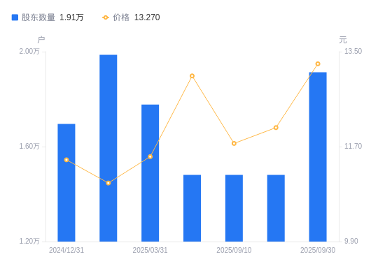 近一年(2024年9月30日至2025年9月30日),继峰股份A股股东户数从1.57万户,增加至1.91万户,增幅21.64%,区间股价上涨4.08%。