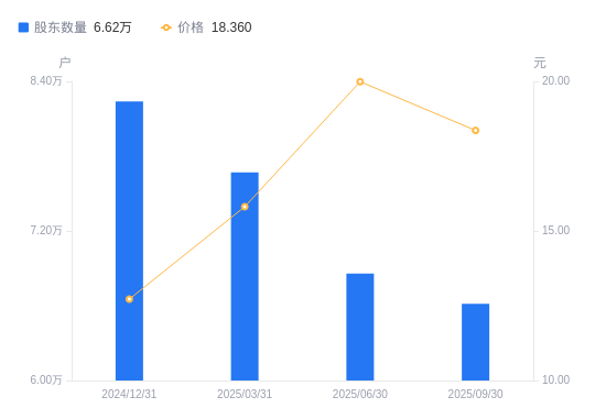 近一年(2024年9月30日至2025年9月30日),金桥信息A股股东户数从7.78万户,减低至6.62万户,降幅14.91%,区间股价上涨62.19%。