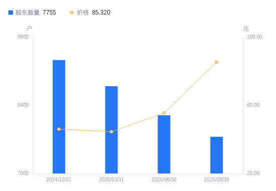 近一年(2024年9月30日至2025年9月30日),芯导科技A股股东户数从8357户,减低至7755户,降幅7.20%,区间股价上涨169.57%。