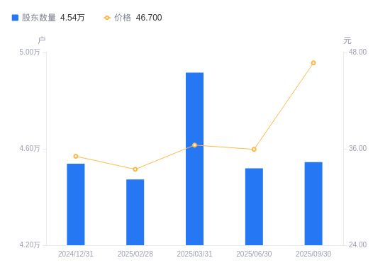 近一年(2024年9月30日至2025年9月30日),西藏药业A股股东户数从4.39万户,增加至4.54万户,增幅3.49%,区间股价上涨33.66%。