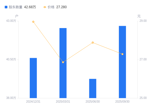 近一年(2024年9月30日至2025年9月30日),伊利股份A股股东户数从52.08万户,减低至42.68万户,降幅18.05%,区间股价上涨3.41%。