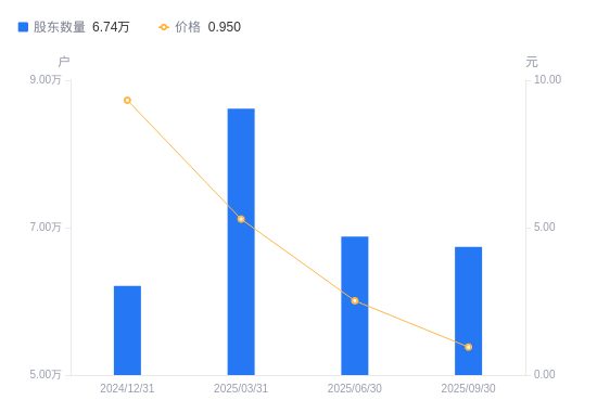 近一年(2024年9月30日至2025年9月30日),*ST苏吴A股股东户数从6.16万户,增加至6.74万户,增幅9.37%,区间股价下跌90.09%。