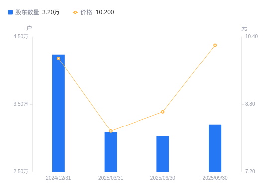10月30日消息,数据显示,截至2025年9月30日,奥翔药业A股股东总户数为3.2万户,较上期(2025年6月30日)增加1708户,增幅5.64%。公司最新A股总股本为8.3亿股,其中流通A股8.3亿股,户均持有流通A股数量为2.59万股,较上期减少1463.19股,降幅5.34%;户均持流通A股市值26.47万元,较上期增加2.84万元,增幅12.01%。