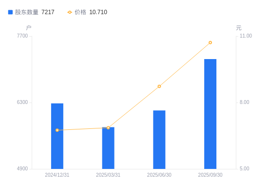10月30日消息,数据显示,截至2025年9月30日,元琛科技A股股东总户数为7217户,较上期(2025年6月30日)增加1083户,增幅17.66%。公司最新A股总股本为1.6亿股,其中流通A股1.6亿股,户均持有流通A股数量为2.22万股,较上期减少3914.24股,降幅15.01%;户均持流通A股市值23.74万元,较上期增加9725元,增幅4.27%。