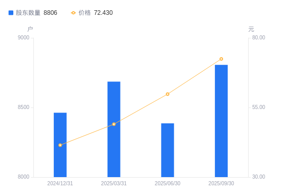 近一年(2024年9月30日至2025年9月30日),迪哲医药A股股东户数从8642户,增加至8806户,增幅1.90%,区间股价上涨91.56%。