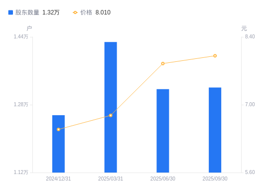 近一年(2024年9月30日至2025年9月30日),博闻科技A股股东户数从1.2万户,增加至1.32万户,增幅10.17%,区间股价上涨33.95%。
