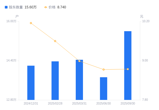 近一年(2024年9月30日至2025年9月30日),中国交建A股股东户数从14.63万户,增加至15.6万户,增幅6.60%,区间股价上涨2.97%。