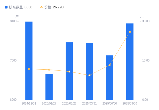 近一年(2024年9月30日至2025年9月30日),上海亚虹A股股东户数从8792户,减低至8068户,降幅8.23%,区间股价上涨166.70%。