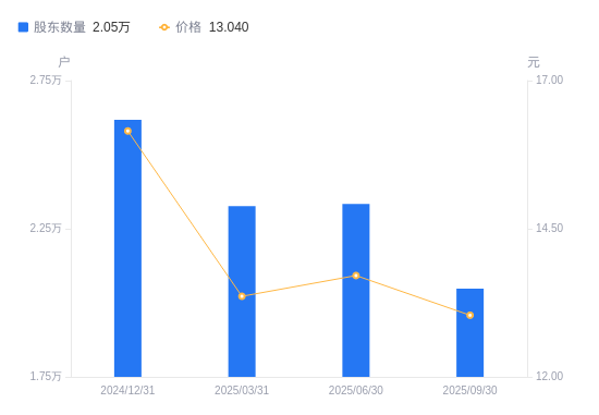 近一年(2024年9月30日至2025年9月30日),香飘飘A股股东户数从1.42万户,增加至2.05万户,增幅44.33%,区间股价上涨6.62%。