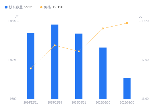 近一年(2024年9月30日至2025年9月30日),友车科技A股股东户数从1.19万户,减低至9922户,降幅16.33%,区间股价上涨22.99%。