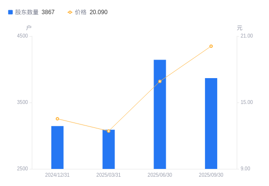 近一年(2024年9月30日至2025年9月30日),路德环境A股股东户数从3538户,增加至3867户,增幅9.30%,区间股价上涨76.38%。