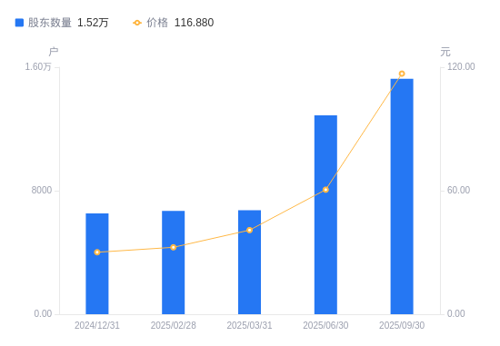 10月30日消息,数据显示,截至2025年9月30日,荣昌生物A股股东总户数为1.52万户,较上期(2025年6月30日)增加2369户,增幅18.39%。公司最新A股总股本为3.55亿股,其中流通A股1.62亿股,户均持有流通A股数量为1.06万股,较上期减少1956.97股,降幅15.54%;户均持流通A股市值124.35万元,较上期增加48.14万元,增幅63.18%。