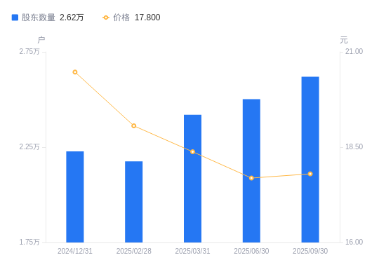近一年(2024年9月30日至2025年9月30日),新奥股份A股股东户数从2.06万户,增加至2.62万户,增幅26.89%,区间股价上涨0.23%。