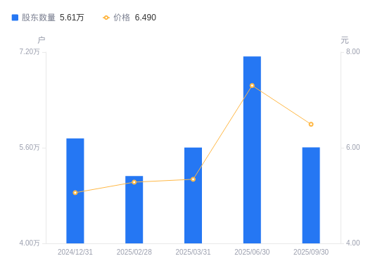 近一年(2024年9月30日至2025年9月30日),国风新材A股股东户数从4.33万户,增加至5.61万户,增幅29.61%,区间股价上涨75.41%。