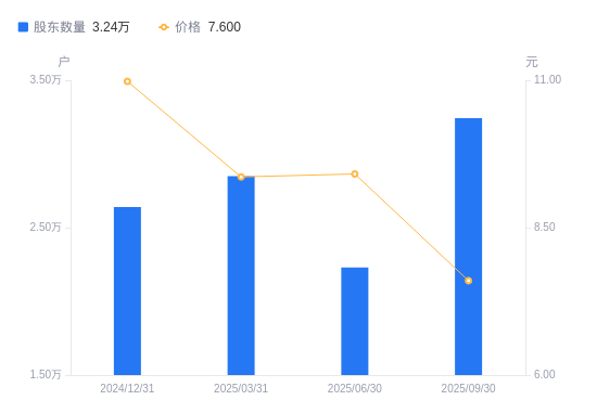 近一年(2024年9月30日至2025年9月30日),山东出版A股股东户数从2.16万户,增加至3.24万户,增幅50.08%,区间股价下跌35.70%。