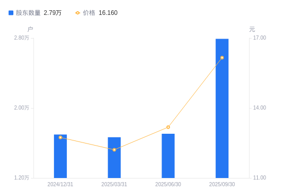 近一年(2024年9月30日至2025年9月30日),天马科技A股股东户数从1.69万户,增加至2.79万户,增幅64.84%,区间股价上涨26.75%。