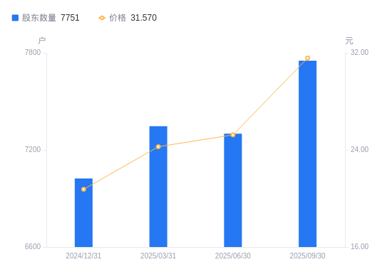 10月30日消息,数据显示,截至2025年9月30日,国盛智科A股股东总户数为7751户,较上期(2025年6月30日)增加451户,增幅6.18%。公司最新A股总股本为1.32亿股,其中流通A股1.32亿股,户均持有流通A股数量为1.7万股,较上期减少1052.13股,降幅5.82%;户均持流通A股市值53.76万元,较上期增加8.12万元,增幅17.80%。
