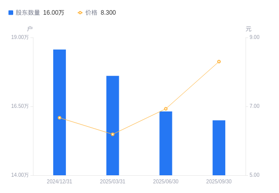 10月30日消息,数据显示,截至2025年9月30日,长江证券A股股东总户数为16万户,较上期(2025年6月30日)减少3220户,降幅1.97%。公司最新A股总股本为55.3亿股,其中流通A股55.3亿股,户均持有流通A股数量为3.46万股,较上期增加682.18股,增幅2.01%;户均持流通A股市值28.69万元,较上期增加5.21万元,增幅22.18%。