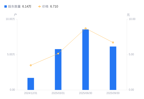近一年(2024年9月30日至2025年9月30日),尤夫股份A股股东户数从1.75万户,增加至6.14万户,增幅250.56%,区间股价上涨109.03%。