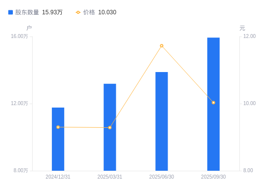 近一年(2024年9月30日至2025年9月30日),江苏银行A股股东户数从12.21万户,增加至15.93万户,增幅30.50%,区间股价上涨32.34%。