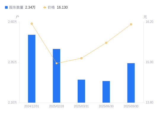 10月30日消息,数据显示,截至2025年9月30日,广州酒家A股股东总户数为2.34万户,较上期(2025年6月30日)增加1107户,增幅4.96%。公司最新A股总股本为5.69亿股,其中流通A股5.69亿股,户均持有流通A股数量为2.43万股,较上期减少1202.13股,降幅4.72%;户均持流通A股市值39.13万元,较上期减少5386.91元,降幅1.36%。