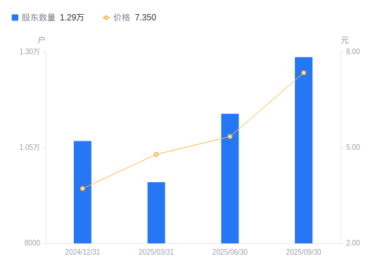 10月30日消息,数据显示,截至2025年9月30日,天创时尚(维权)A股股东总户数为1.29万户,较上期(2025年6月30日)增加1479户,增幅12.99%。公司最新A股总股本为4.2亿股,其中流通A股4.2亿股,户均持有流通A股数量为3.26万股,较上期减少4236.38股,降幅11.49%;户均持流通A股市值23.98万元,较上期增加4.26万元,增幅21.59%。